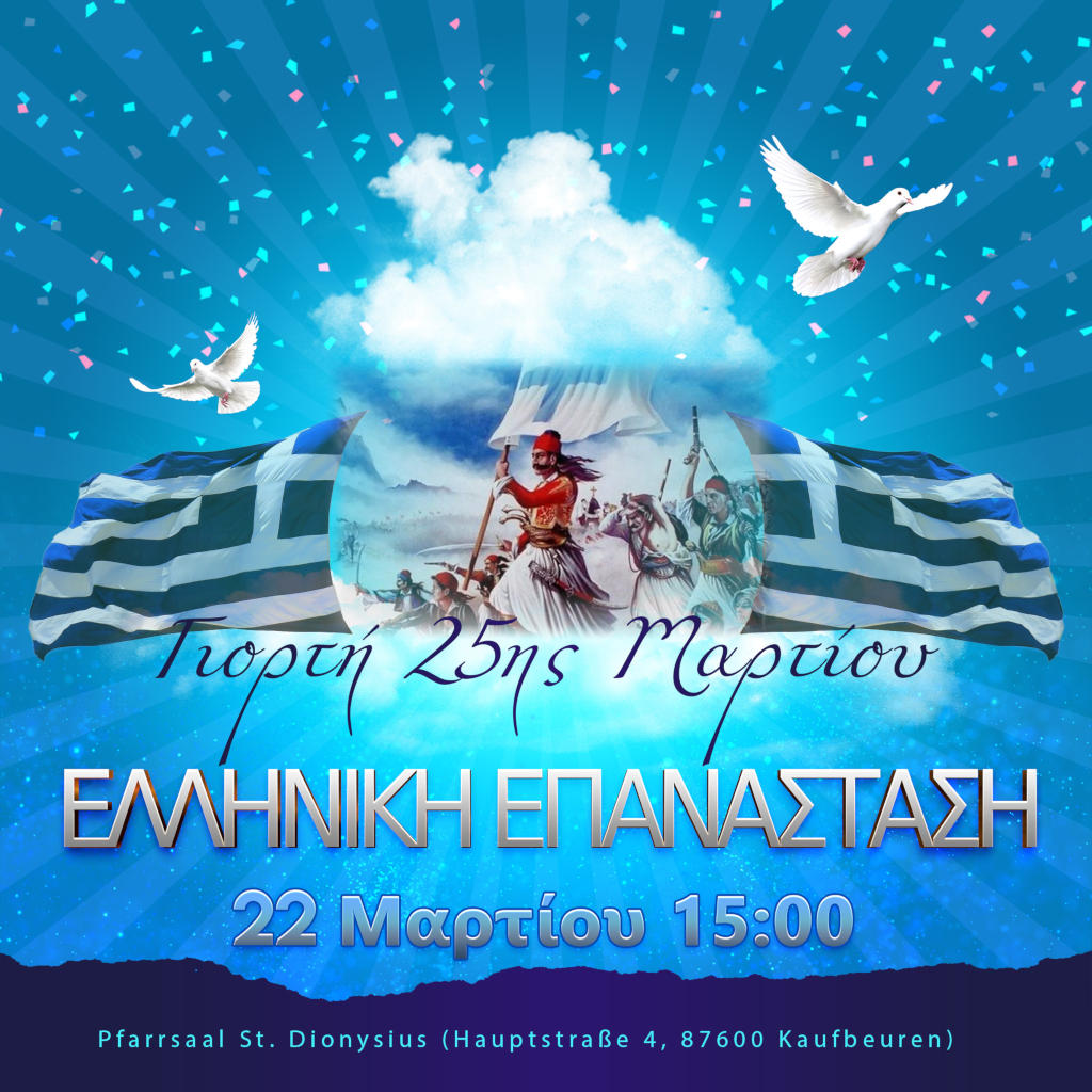 Σας προσκαλούμε να τιμήσουμε μαζί την εθνική επέτειο της 25ης Μαρτίου, το Σάββατο 22 Μαρτίου και ώρα 15:00, στον χώρο Pfarrsaal St. Dionysius (Hauptstraße 4, 87600 Kaufbeuren).