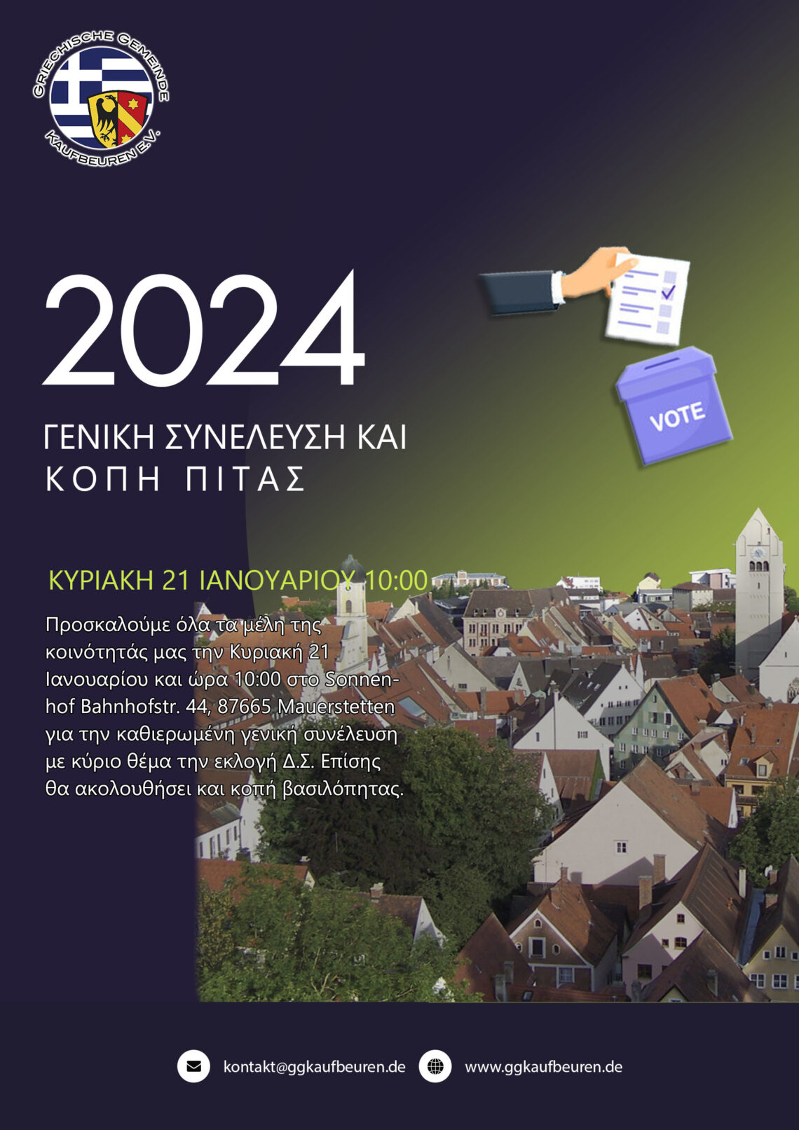 Προσκαλούμε όλα τα Μέλη της Κοινότητας μας την Κυριακή 21.1.2024 και ώρα 10.00 στο Sonnenhof Bahnhofstr 44, 87665 Mauerstetten για την καθιερωμένη γενική συνέλευση με κύριο θέμα την Εκλογή του Δ. Σ. Επίσης θα ακολουθήσει και κοπή Βασιλόπιτας!