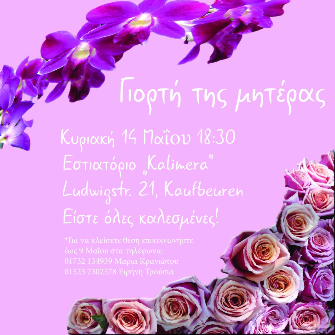 Aus diesem besonderen Anlass laden wir Sie alle zu einer Dankbarkeitsfeier zu Ehren und in Anerkennung der Opfer, der Liebe und der Hingabe, die eine Mutterschaft erfordert, am Sonntag, den 14. Mai um 18:30 Uhr in das Restaurant "Kalimera", Ludwigstr. 21, Kaufbeuren, ein. Um einen Platz zu reservieren, melden Sie sich bitte bis zum 9. Mai unter die Telefonnummern: