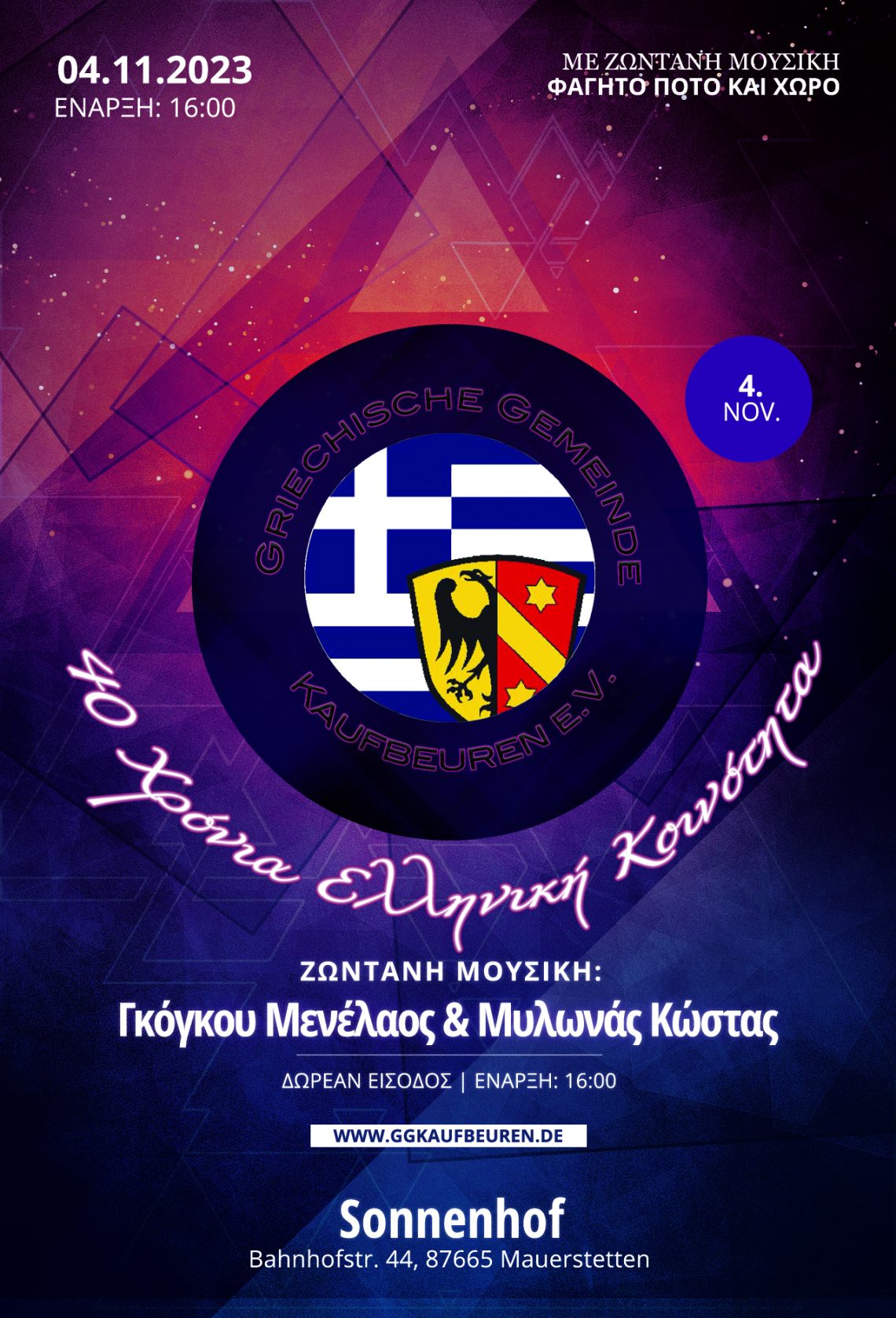 Kommen Sie und feiern Sie 40 Jahre griechische Gemeinde mit Tanz, Musik und viel Freude! Diese Veranstaltung steht allen offen, unabhängig von Herkunft und Alter. Es ist eine Gelegenheit, unsere kulturelle Erbe durch Tanz und Unterhaltung zu erleben.